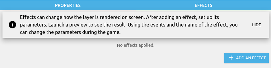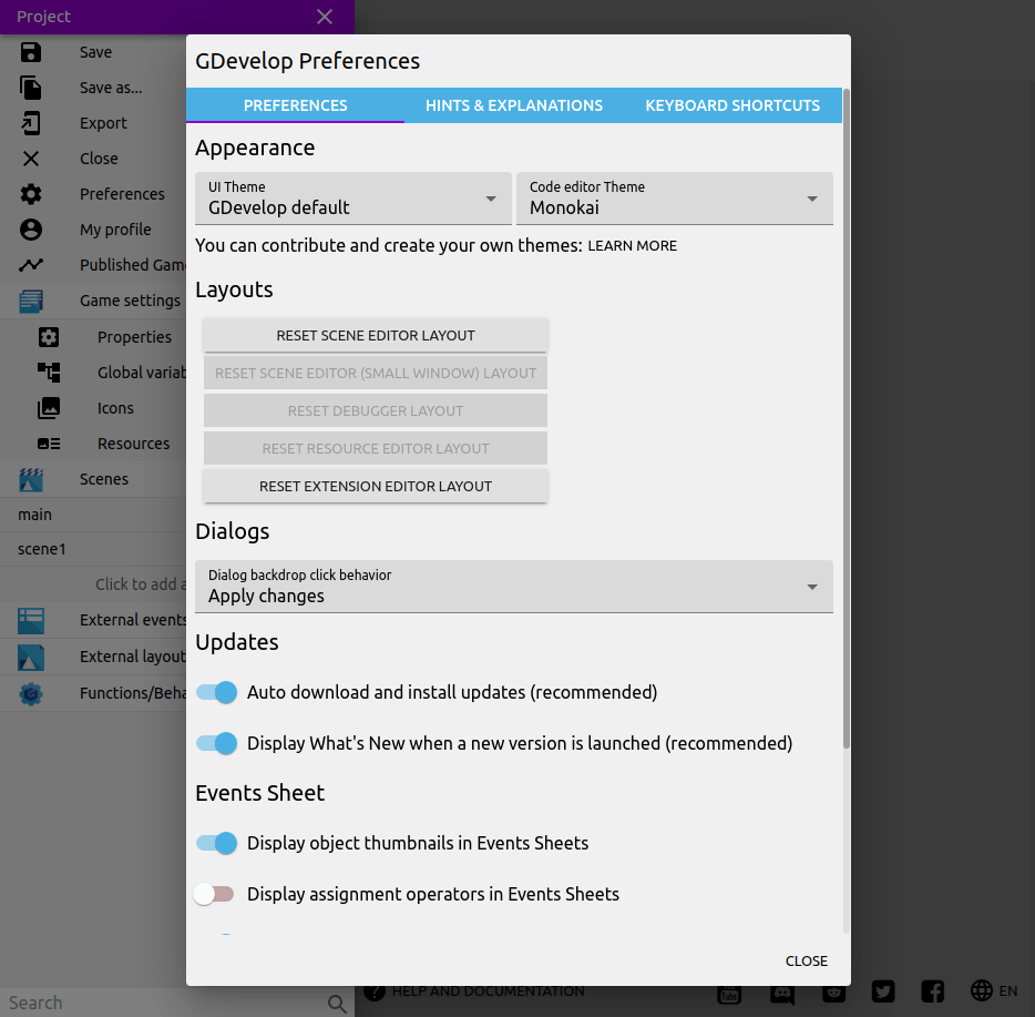 GDevelop displays hints and explanations for certain features. You can turn them off if you prefer.
