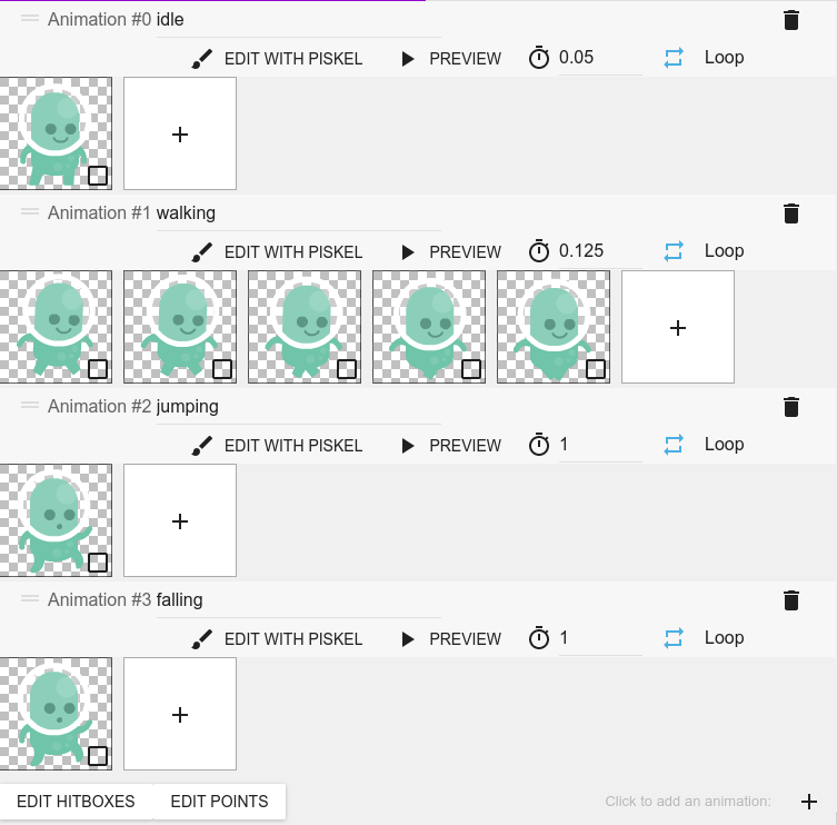 Instead of the animation, we could have created here a dedicated Scene Variable "state" to control the player state. This is more advanced but allows for better flexibility. However, the approach presented here has the benefit of bundling the logic with the corresponding animation, allowing for clarity and simplicity in the event sheet. Furthermore, you have access to the frames of the current animation/state and can trigger some logic at a certain frame inside the animation.